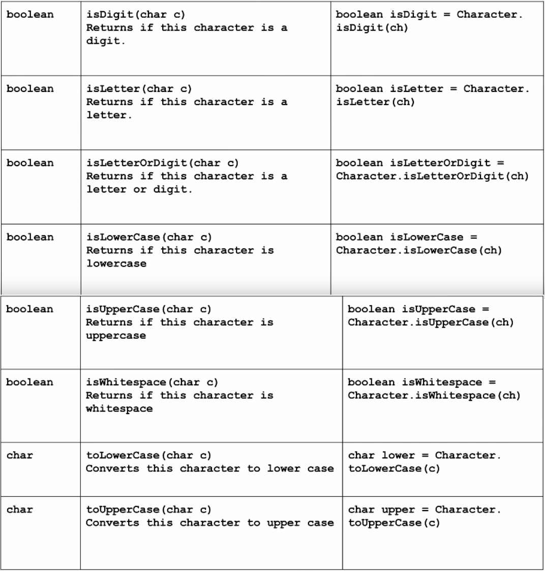 For a full list of all the methods in the Character class, you can visit the relevant page in the Java documentation here. But for now, we will just be focusing on the methods in the table above.